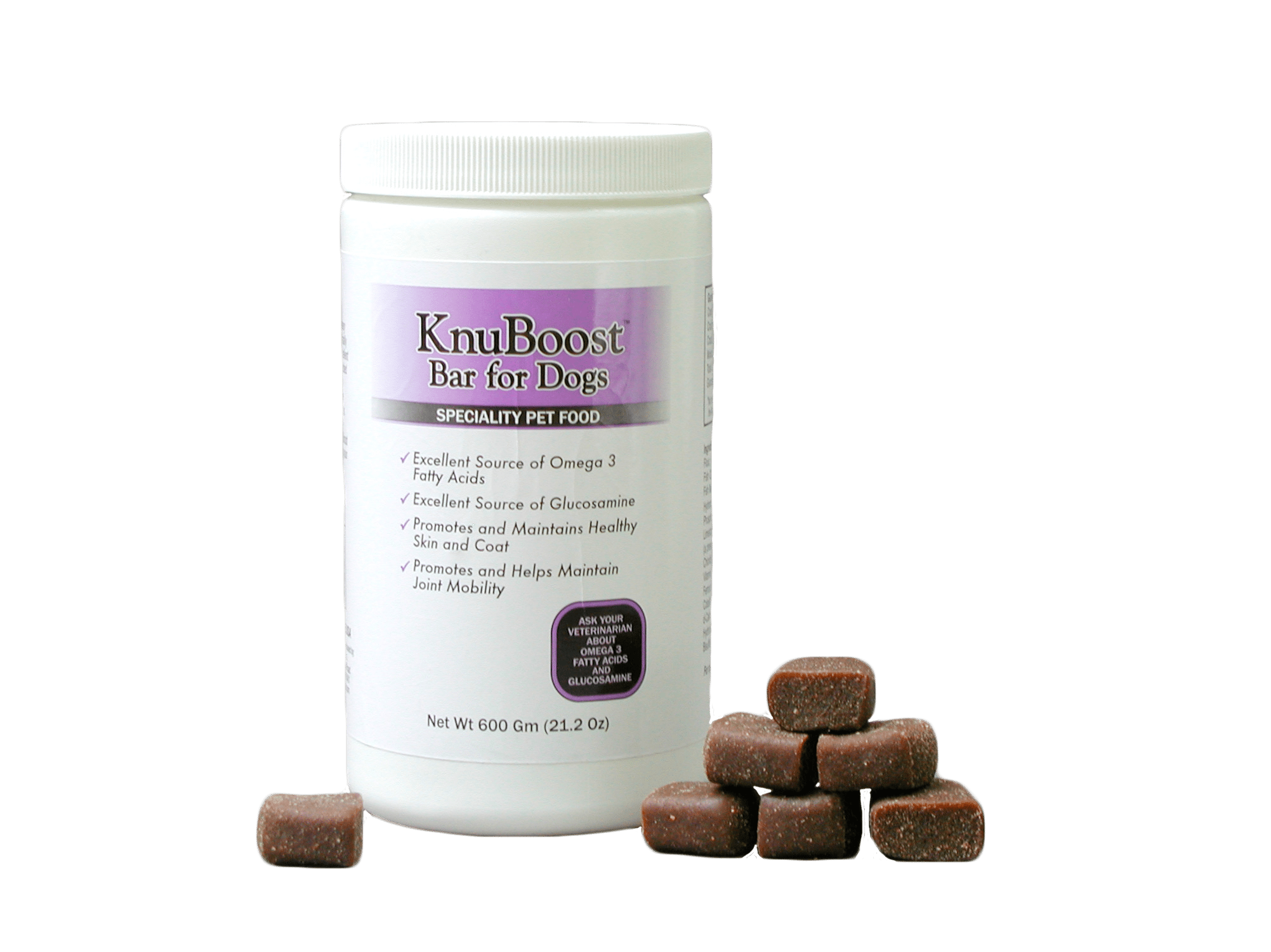 KnuBoost™ Bars are high in both Omega 3 Fatty Acids and Glucosamine, both of which work together to promote healthy joints while minimizing joint pain for your pet. Omega 3 Fatty acids have been proven to help maintain healthy joints, while glucosamine aids in the body's natural healing process. To learn more about how KnuBoost™ Bars can help your pets with mobility and joint pain, Click Here